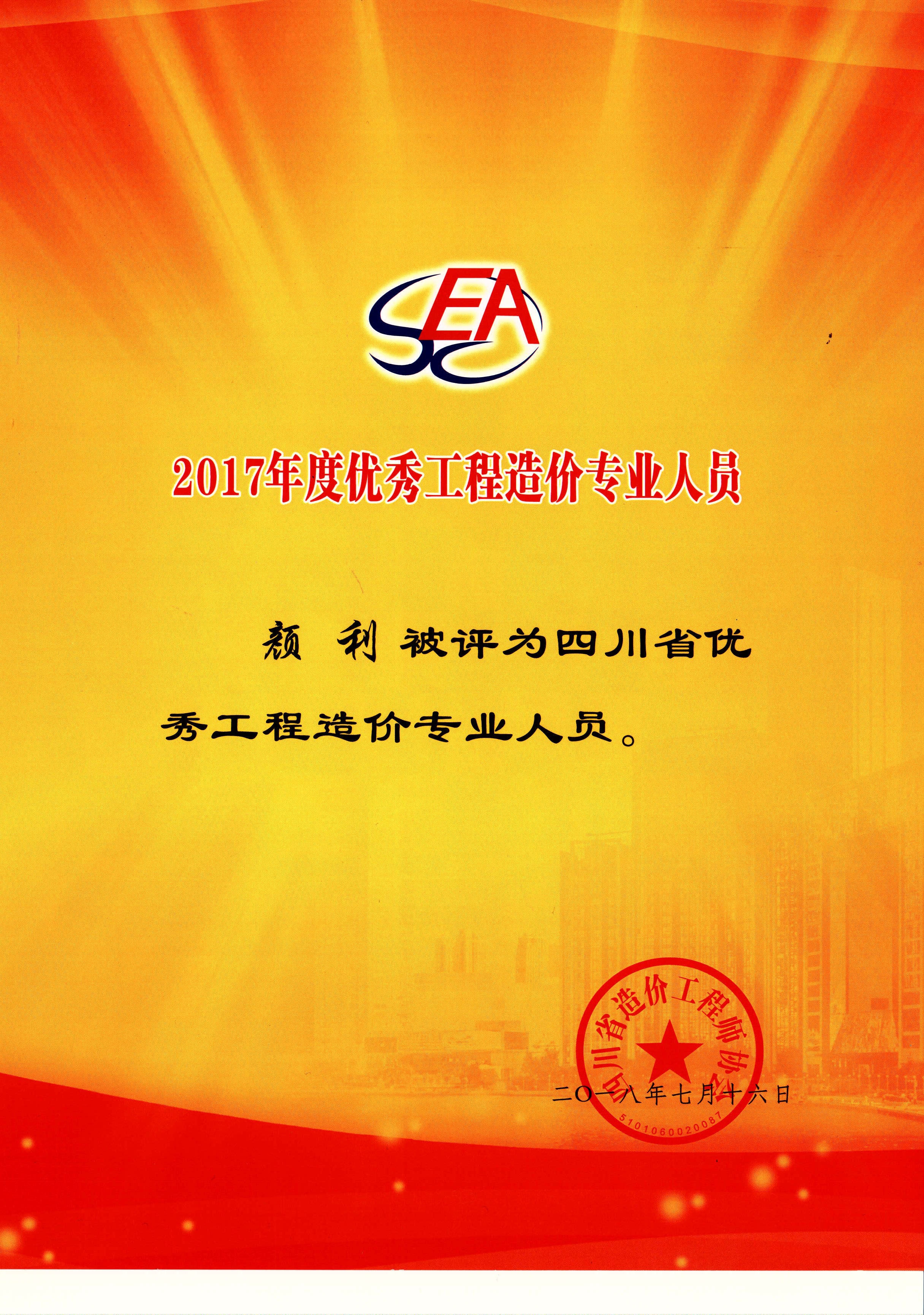 2017年度四川省优秀造价专业人员(颜利)